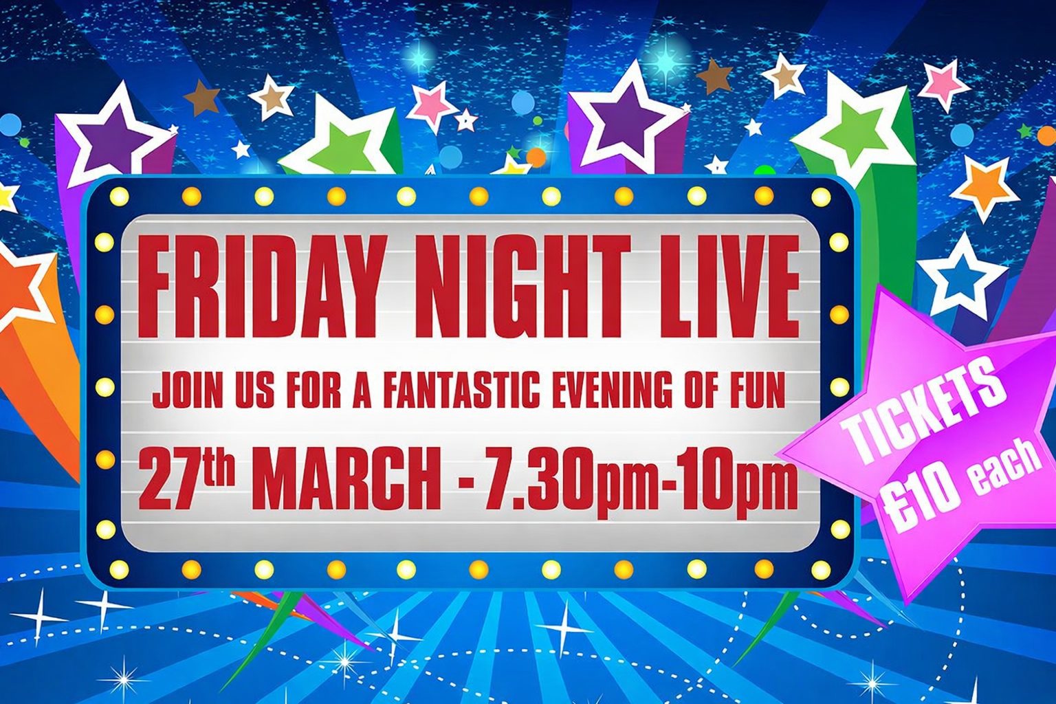 Friday Night Live is a fun-filled evening of entertainment, laughter and great company on Friday 27th March, from 7.30pm to 10.00pm. Join us for a fantastic evening of games inspired by classic TV game shows including What’s My Line, Blankety Blank, Mr & Mrs, Would I Lie to You, Play Your Cards Right, Copycats and more. Tickets are £10 each and fantastic entertainment, raffle and a cash bar are also available.