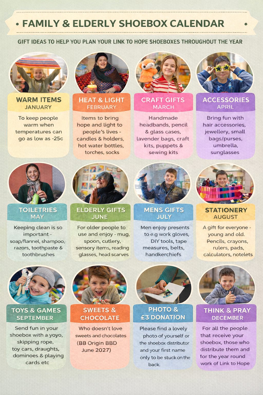 For all year round suggestions on what to put in your shoebox please download our Shoebox Appeal Calendar as this will also help you plan your purchases and spread the cost of the appeal.